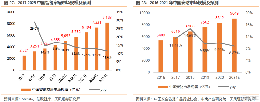 行業空間上, IDC預計,全球智慧城市支出將在2021年開始逐漸加速增長,並在2020-2024年期間實現14.6%的複合增長。細分領域中,智能家居2020年整體市場規模為4355億元,同比16.8%(統計包含智能家居硬件設備,設計、安裝、維修等相關服務費用,網絡服務費用)。2019年安防行業市場規模達7562億元,16年以來複合增長率為11.9%。