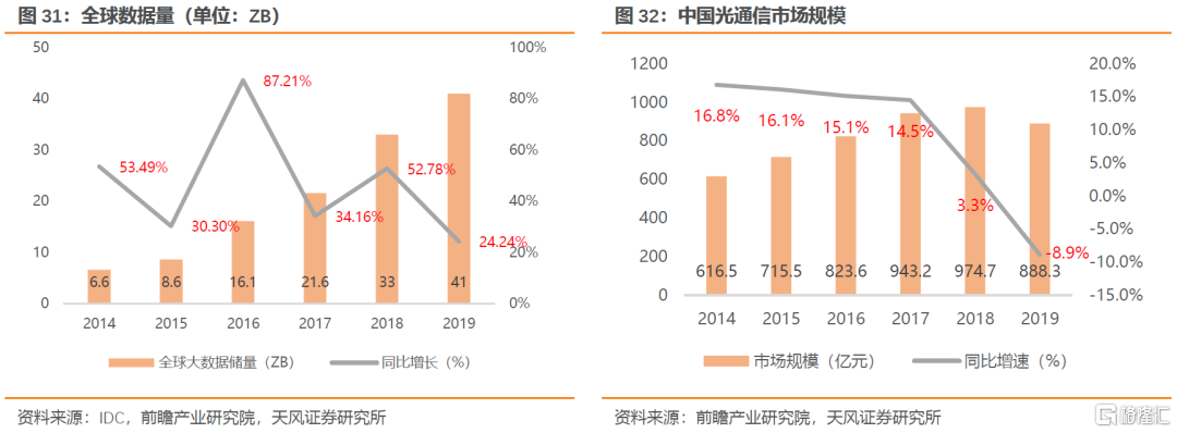 光通信之於5G:光通信是以光子作為信息傳輸的載體,光子本身具有極快的響應能力、極強的並行能力,而且無電荷,將其作為信息的載體無電磁干擾情況又具備極好的保密性;信息時代數據流量規模快速膨脹,“光進銅退”(即以"窄帶+銅纜"為主網絡向以"寬帶+光纖"網絡轉變)就成了通信行業發展的必然趨勢。5G的骨幹網、承載網以及基站與基站之間的連接都離不開光通信。