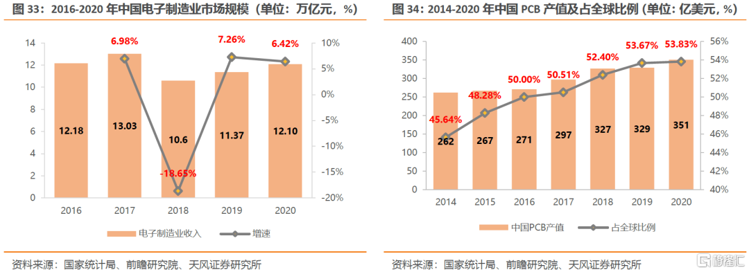 行業空間:我國電子製造業市場規模較大,市場容量基本處於10萬億元以上。根據國家統計局數據,2020年我國電子製造業市場規模約為12.10萬億元,同比增長6.40%。新興電子產品不斷湧現,使印製電路板產品的用途和市場不斷擴展。2014-2020年,國內PCB產值年複合增長率為4.99%,達到351億美元。下游行業需求的持續快速增長,5G基站的建設將帶動作為基礎元器件的高頻、高速 PCB 的發展,預計2019-2024年以4.3%的年複合增長率增長,到2024年全球PCB行業產值將達到758.46億美元。