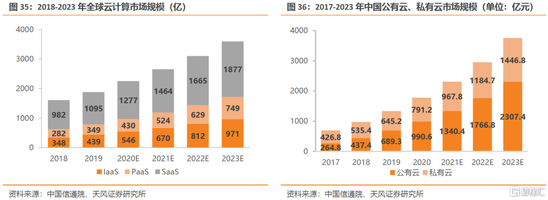 4)雲計算的三種服務模式(SaaS、IaaS、PaaS):從份額上來看,2019 年全球SaaS市場規模佔全球雲計算市場規模的比例達到 58.15%,預計未來幾年仍將佔據主要的市場份額。