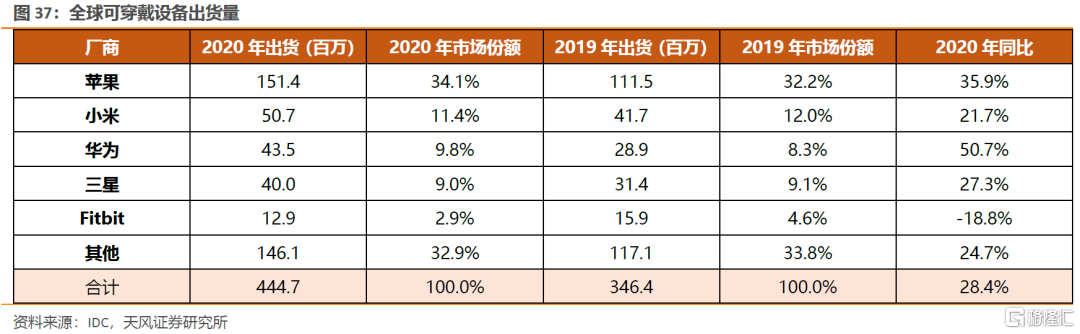 另一方面,疫情催化下各類可穿戴設備需求有望超預期增長。目前可穿戴設備的產品形態主要有智能眼鏡、智能手錶、智能手環、智能服飾等,功能覆蓋健康管理、運動測量、社交互動、休閒遊戲、影音娛樂、定位導航、移動支付等諸多領域。據IDC數據,2020全年,全球可穿戴設備出貨量為4.447億部,同比增長28.4%。按出貨量排名前五的廠商分別是蘋果、小米、華為、三星、Fitbit。