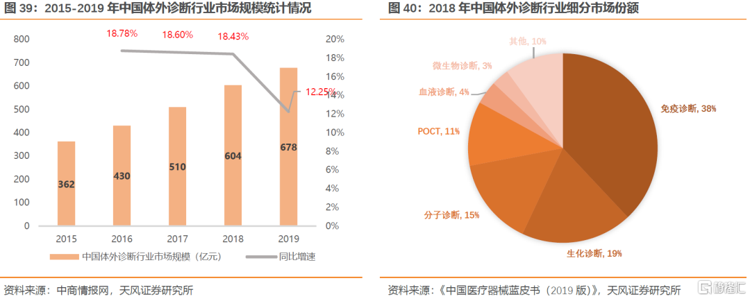 過去一年多部分由於疫情的影響,科創板上市了多家體外診斷領域的公司。近二十年中國體外診斷產業化程度迅速提高,16年以來始終保持兩位數增速。細分領域來看,我國體外診斷市場由免疫診斷、生化診斷、血液學及體液、即時檢驗、分子診斷等細分領域構成。目前免疫診斷佔比最高,分子診斷增速最快。