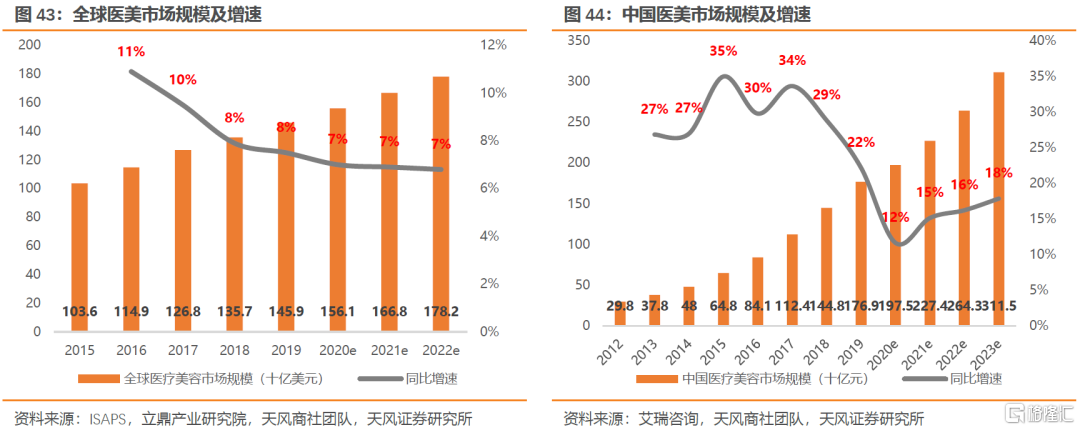 板塊驅動力一方面來自人均可支配收入增加、個人醫美意識提升和醫美消費年輕化帶來的行業空間擴容;與美國、巴西、韓國等國家相比,國內醫療美容滲透率仍然不高。
