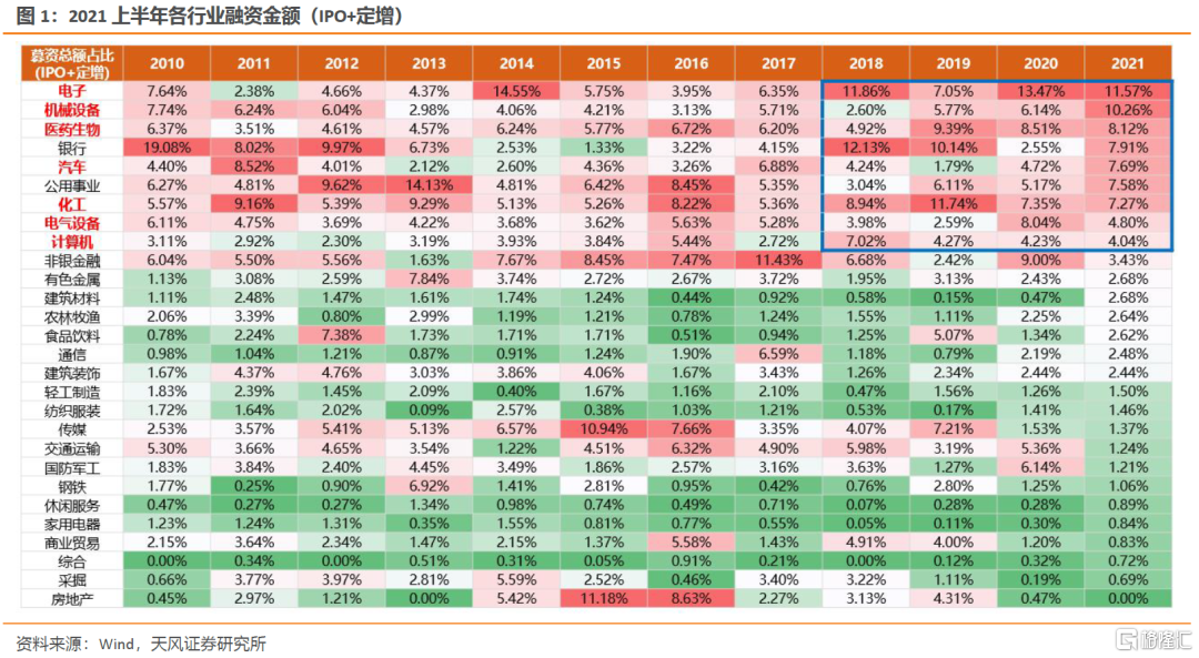 十九大以來,發展思路逐步由總量擴張向提質增效過渡,以科創板、創業板註冊製為標誌性事件,權益市場更多地承擔起對新興產業的融資功能,過去三年融資環境明顯地偏向新興產業和高端製造。2021年上半年,電子、機械、醫藥、汽車、化工、電氣設備、計算機行業的融資金額(IPO+定增)佔到全市場的54%。