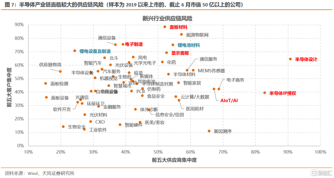 1)半導體行業具備強國產替代邏輯,則相對而言也是目前供應鏈風險最突出的板塊。多家上市公司在財報中提到了原材料供應集中度過高的問題,從我們的樣本來看,半導體行業上游供應商集中度和下游客户集中度都較高。且由於目前主要原材料依賴進口,後續仍面臨貿易摩擦(如“實體清單”管制)等不確定因素。