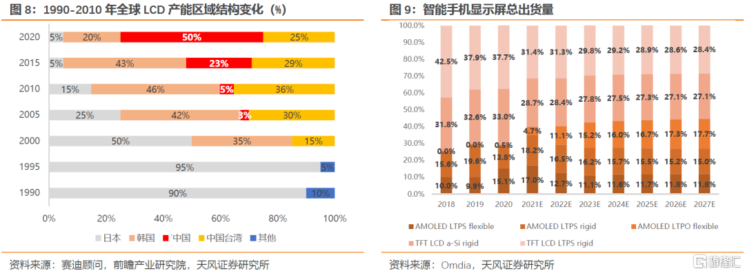 1)過去10年全球LCD產能加速向國內遷移。2010年中國大陸LCD產能佔全球5%(彼時中國台灣佔36%);2020年中國大陸份額提升至50%(中國台灣25%);日本1995年產能佔比95%,目前為5%。