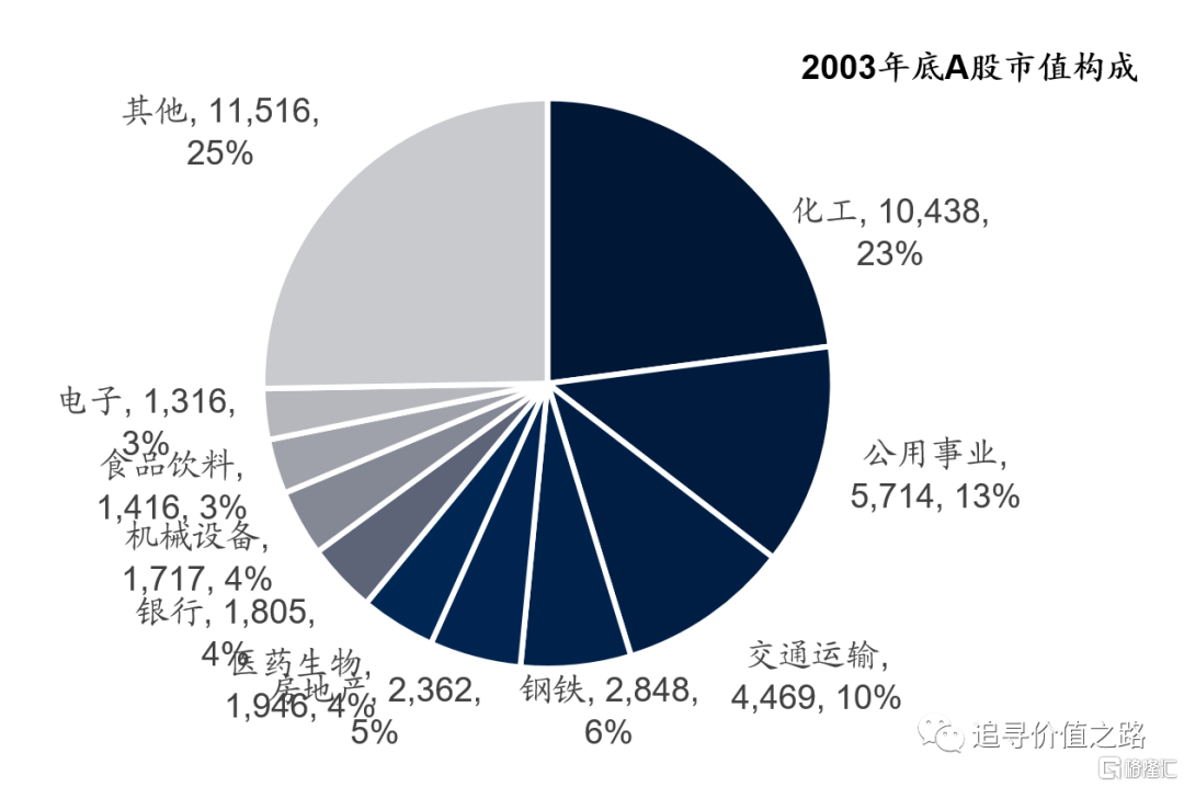 2001年中國入世以後,一直到2007年前,A股市場的行情特徵是從“五朵金花”到“煤電油運”再到“煤飛色舞”,整體就是重工業順週期板塊的行情。2003年底A股的總市值構成中,化工行業佔比排第一,其次是公用事業、交通運輸、鋼鐵、房地產等。這樣的行業市值分佈狀況與前文中我們看到的50年代末期美股的行業市值分佈,是不是有異曲同工之妙。