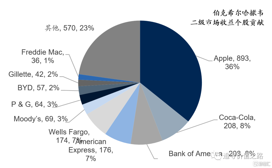 2498億美元二級市場累計(最大)收益中,收益最大的10個股票投資(蘋果公司、可口可樂、美國銀行、美國運通、富國銀行、穆迪公司、保潔公司、比亞迪H股、吉列公司、房地美)合計收益(最大)1928億美元,佔比77%(具體參見下圖),頭部集中效應非常明顯。