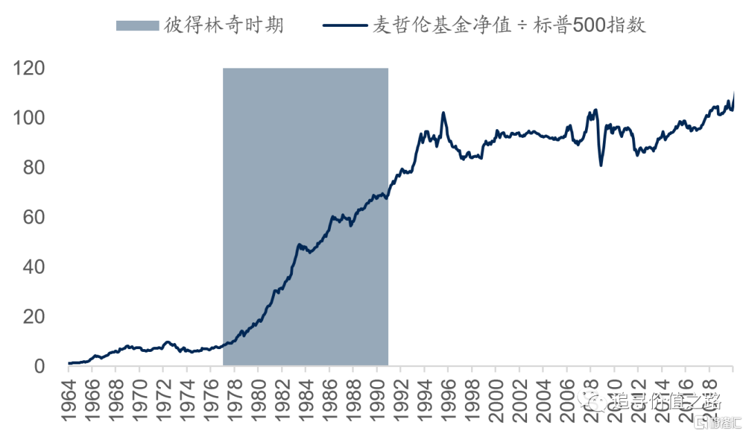 彼得林奇1977年接管麥哲倫基金,1990年退休。從1976年底起算,到1990年底,麥哲倫基金淨值累計增長25.7倍,年化複合收益率約26.5%,同時期標普500指數累計增長207%,年化複合收益率8.3%。在彼得林奇執掌期間,麥哲倫基金幾乎是持續跑贏標普500指數的(見下圖)。