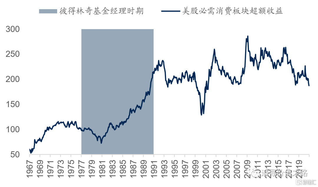 從彼得林奇寫的幾本著作中(包括《戰勝華爾街》、《彼得·林奇的成功投資》等),我們可以知道,彼得林奇的投資風格主要集中在消費股中,他提倡從日常生活中獲得投資機會的靈感。而他管錢的時代也正好是美股的“大消費”時代,時勢造英雄,一點不錯。