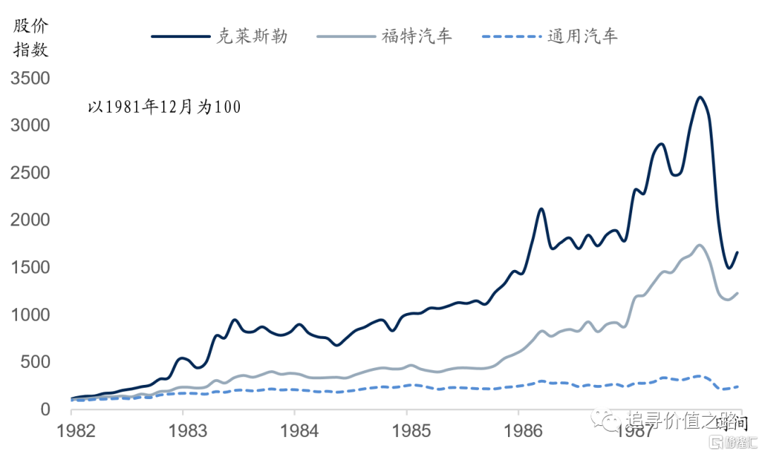 個股選擇上,彼得林奇主要看好福特汽車和克萊斯勒汽車公司,以及歐洲汽車公司沃爾沃,不看好通用汽車公司,林奇説道:“我從來不會持有太多的通用汽車股票,即使是在當時汽車行業一片大好的年代裏。因為我可以把通用汽車公司稱為一個糟糕的公司,這種稱呼已經算是最客氣的了。”事實也確如彼得林奇所言,在1982年至1987年的大行情中,克萊斯勒汽車和福特汽車都是十倍股的大牛股,而通用汽車公司股價也有上漲,但上漲幅度遜色太多。