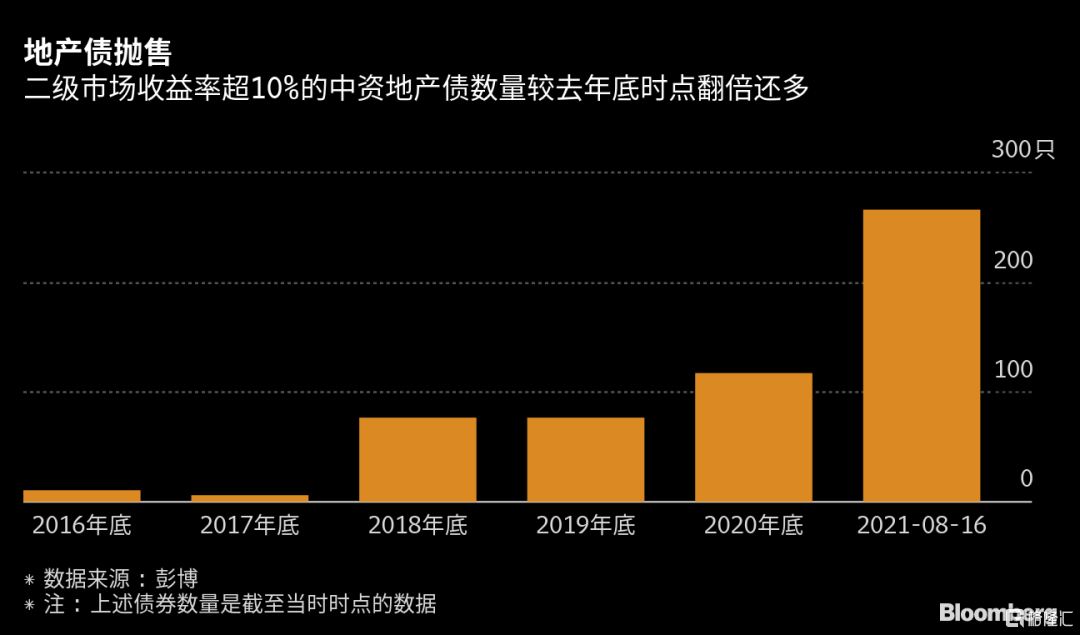 彭博彙總的2016年以來數據顯示,截至8月16日,境內外不含城投的中資房地產債券中,二級市場買價到期收益率在10%以上的債券存續規模約1000億美元,而以只數計則有266只,數量是去年末的2.3倍。