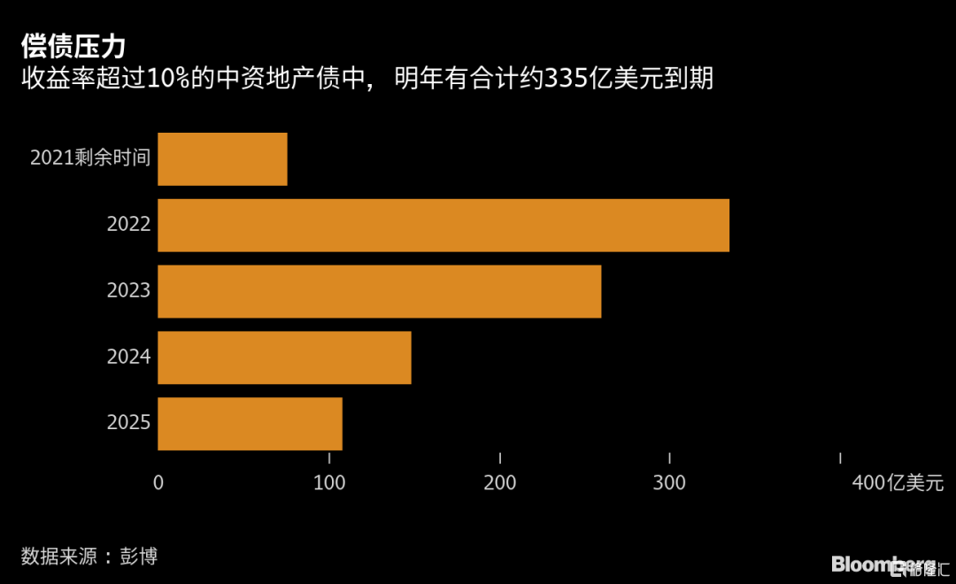 二級市場債券收益率飆高將增加企業再融資難度,在當前投資者普遍規避地產債的大環境下,房企面臨的償付挑戰不言而喻。據彭博數據,前述收益率超過10%的地產債中,2021年剩餘時間的到期量在76億美元左右,2022年將迎來近335億美元的到期高峯;而這些債券當前的收益率中值約17%,較此前多年不超過14%的水平大幅抬升。