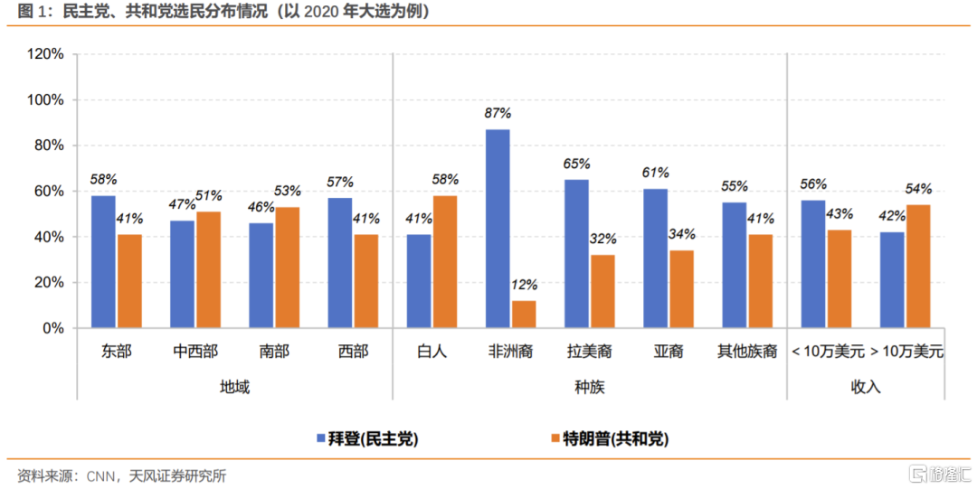 美國兩黨選民基礎有很大不同,共和黨的核心選民主要在美國的南部、中部、中西部地區,主要由白人、企業家、保守派知識分子構成;民主黨的核心選民主要分佈在東部、西部地區,以黑人、猶太人、拉美裔美國人為主,這其中主要包括工會會員、天主教徒、自由派知識分子。從收入情況看,中產階級偏上層選民主要支持共和黨,中產階級偏下層則相對支持民主黨。