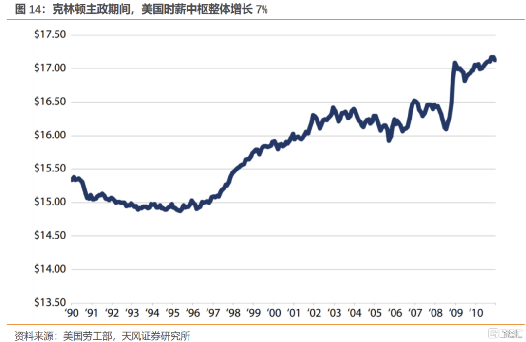 ① 提高最低工資。1996年,國會通過法案將最低時薪由4.25美元逐步提高至5.15美元,增幅近20%。根據美國勞工部測算,該法案提高了近1000萬美國人的收入,且從後期實證研究的結果看,法定提薪帶來的用人成本提升對整體就業沒有負面影響。