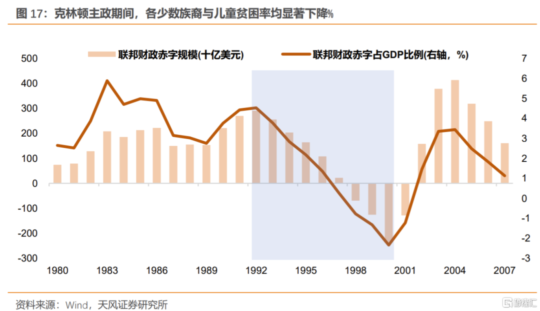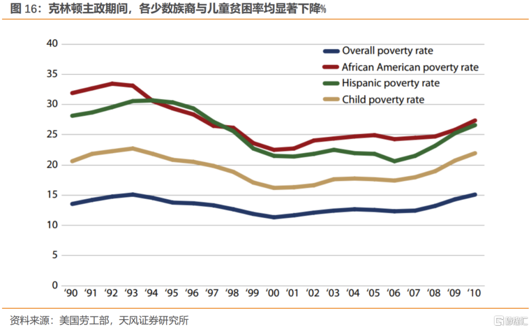 從結果看,克林頓提高中產階級比重與彌合貧富差距的政策成效顯著,隨着數以百萬計的人口步入中產階級,少數族裔貧困率大幅下降帶動整體貧困率下降約1/3,實現了均富的效果。