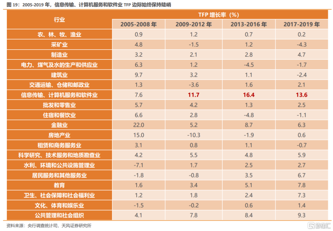 (1)汲取克林頓時期互聯網泡沫破裂的教訓,對於信息傳輸、計算機服務和軟件業及金融業等TFP邊際較高的行業,在藉助其“花小錢辦大事”的屬性實現總量邊際修復的同時,為促進部門間的公平,反壟斷、反腐敗等將持續推進,保證行業規範發展。