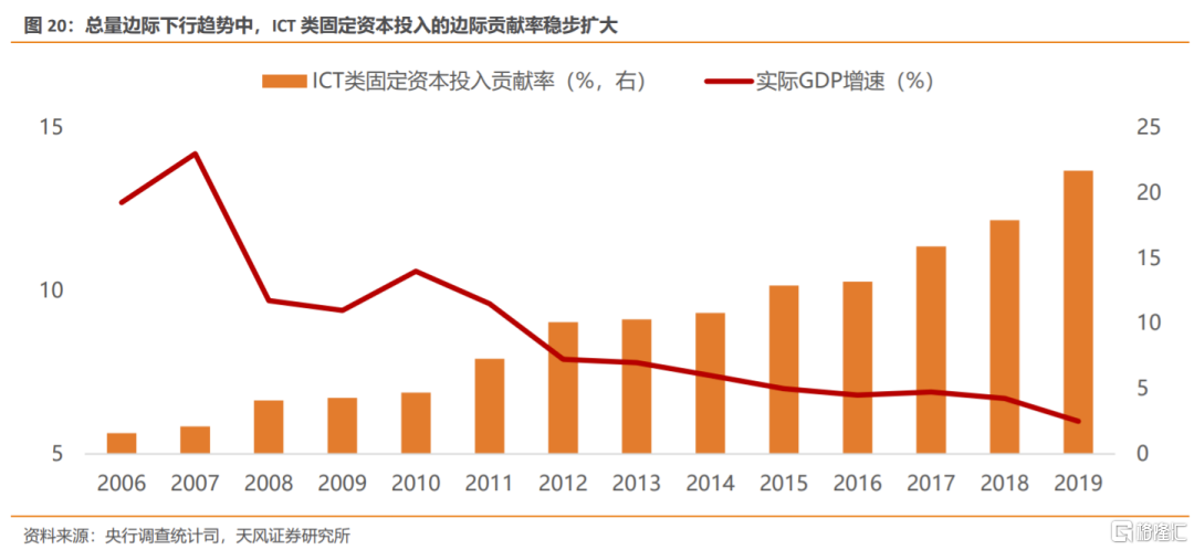 財政跨週期調節即將啟動疊加政府部門去槓桿,對財政發力提出了“花小錢辦大事的要求”,中期產業政策料將持續向高端製造業傾斜。克林頓經濟的一大亮點在於響應第三次科技革命的號召,大力發展高新技術和信息產業,在這一產業政策指導下,IT產業晉升為美國經濟的支柱產業,同時美國也在IT、生物技術、新材料、航天航空等高新技術領域取得全球領先的地位。對於新興產業本身,根據央行調統司測算,2009-2019年間,我國信息傳輸、計算機服務和軟件業TFP始終保持兩位數以上的增長率,居全行業之首,同期建築業TFP邊際遞減至負增;此外,調統司數據還顯示,2006-2019年總量邊際高低切換,通訊信息類固定資本投入對總量邊際貢獻率由1.6%逐年遞增至21.7%,十三年間貢獻率增幅達到了1256.3%。因此,在總量邊際承壓疊加政府去槓桿的大環境下,財政跨週期工具向通信、科技等產業傾斜,能顯著改善總量邊際結構,在避免槓桿擴大的基礎上高效率地實現總量邊際修復需求,做到“花小錢辦大事”。