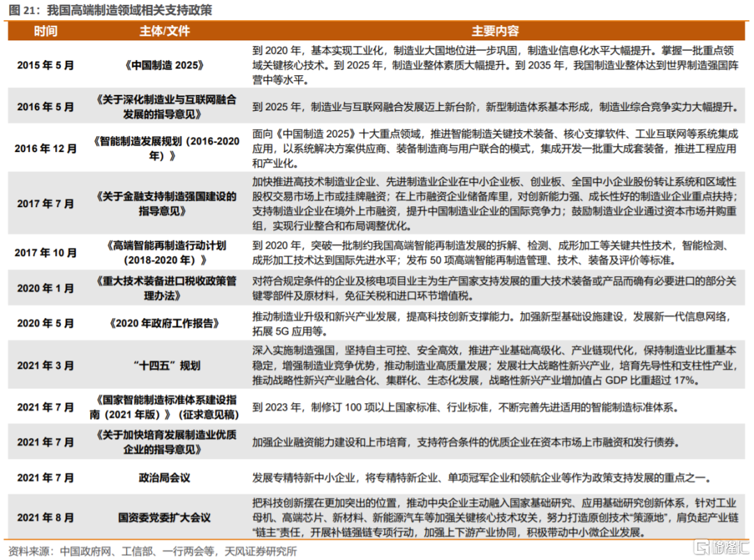 近幾年,我國產業政策已持續向高端製造業傾斜。截止目前,我國先後出台《中國製造2025》、《智能製造發展規劃(2015-2020年)》、《高端智能再製造行動計劃(2018-2020年)》等一系列高端裝備、智能製造領域專項支持政策;十四五規劃強調深入實施製造強國,發展壯大包括新一代信息技術、生物技術、新能源、新材料、高端裝備等在內的戰略新興產業。此外,財税與融資政策等也鮮明表現出扶持高端製造業的態度,相關產業或將迎來戰略性發展機會。