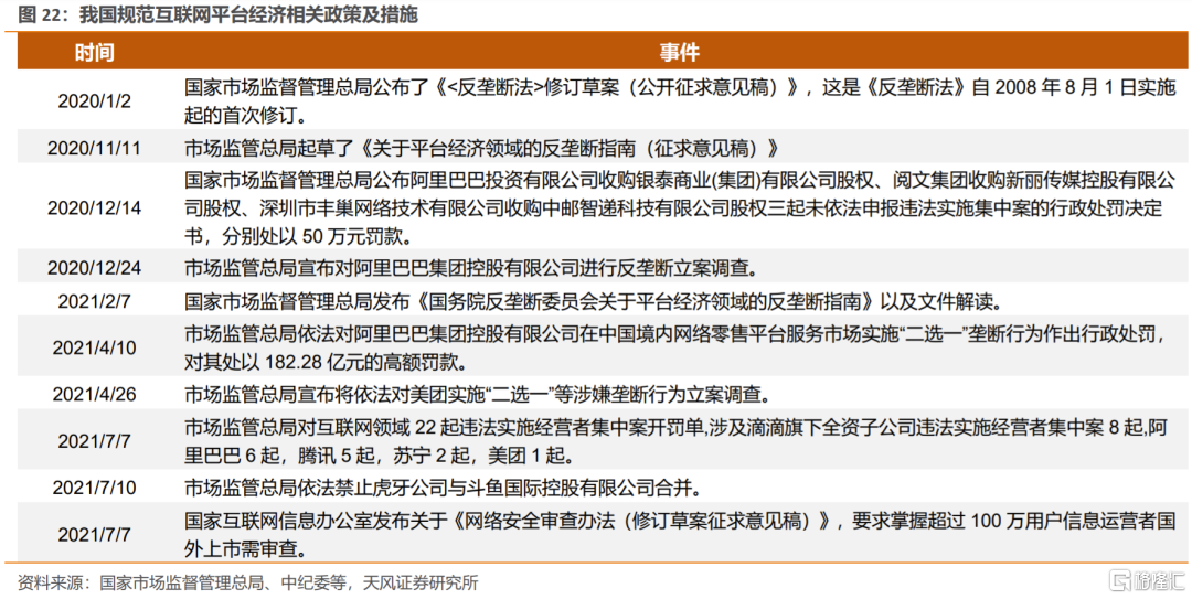 規範平台經濟方面,《<反壟斷法>修訂草案》和《關於平台經濟領域的反壟斷指南》先後公開徵求意見,拉開了我國反壟斷的大幕,隨後監管政策密集出台落地。金融反腐同是近年監管工作的重點之一,在2020年十九屆中央紀委四次全會上,總書記強調持續深化金融領域反腐敗工作;中央財經委員會第十次會議指出,要統籌做好重大金融風險防範化解工作。