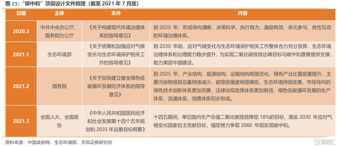 我國已基本建立起碳中和政策體系雛形,從頂層設計上保障了政策的持續性。供給側方面,側重實現能源供應領域清潔化與低能效行業領域技術改造升級相結合;需求側方面,側重提高交通領域低碳化與新能源化升級等。在完善的頂層設計指導下,各地方與行業的配套規範與政策料將持續推進。