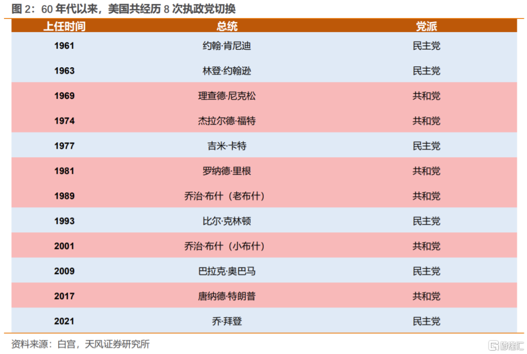 因此可以歸納為,共和黨更注重效率,而民主黨更注重公平。60年代以來,美國累計經歷了8次效率與公平的切換,映射到兩黨的執政理念,主要有以下幾方面差異: