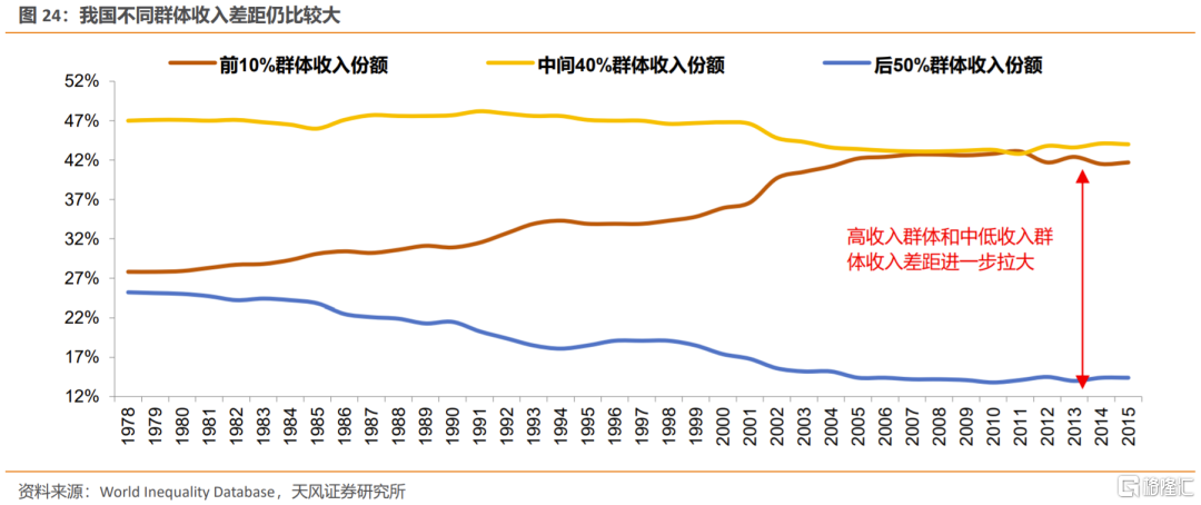 我國收入分配不均的問題長期存在。根據世界財富與收入數據庫的測算,我國收入前10%的人羣佔據超過40%的居民總收入,而收入後50%羣體佔居民總收入比重不到15%,不同羣體之間收入差距目前仍比較大,且疫情以來中產階級收入面臨工資端與就業端的雙重打壓,貧富差距走闊勢能漸強。