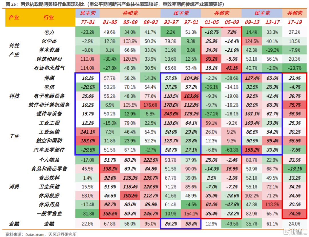 參考美國50年效率與公平切換史,共和黨主政時期傳統行業與消費行業在權益市場的表現通常較好,而民主黨主政時期科技等高端製造業板塊表現則顯著佔優。可以歸納為,側重效率的政策環境有利於傳統行業與消費行業,側重公平的政策環境有利於科技、高端製造、金融行業的市場表現。