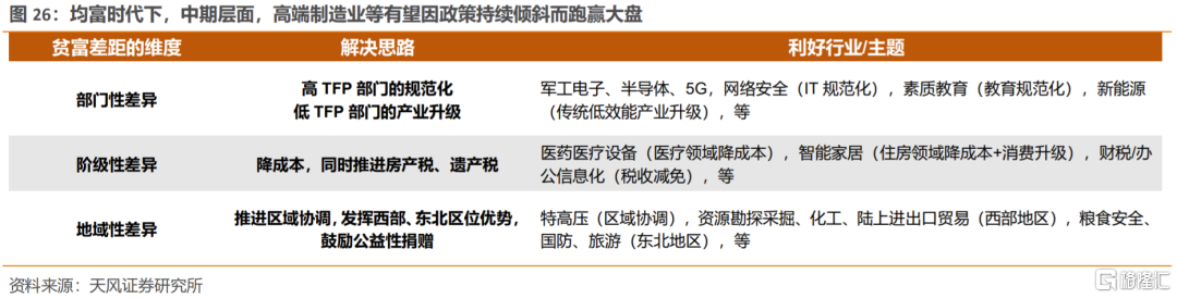 2)後遺症之二:諸如尋租、腐敗、壟斷、環境污染等的灰色地帶。對應地,反腐敗、反壟斷、碳中和將大力推進。落實到產業層面,主要有兩大方向:①汲取美國互聯網泡沫破裂教訓,規範IT、金融、教育等高TFP邊際行業發展;②對低TFP部門實施產業結構升級調整,使其“高端製造化”,如碳中和推進能源供應領域的新能源替代等。