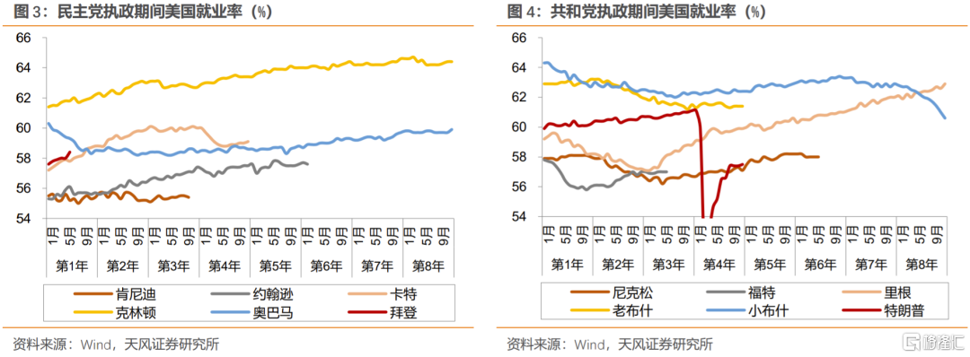 2)社會政策上,民主黨更強調人權、社會平等,主張加強婦女權益保護,反對工作歧視,反對種族歧視;共和黨則更加維護個人自由,同時反對過多關注弱勢羣體。因此可以看到,民主黨執政期間的就業情況往往表現更好,美國本土就業率多呈上升趨勢;共和黨執政期間,除里根政府之外,美國並未出現就業率的明顯改善。此外,兩黨在同性戀權利、槍支管制、胚胎幹細胞研究等方面也存在一定分歧。