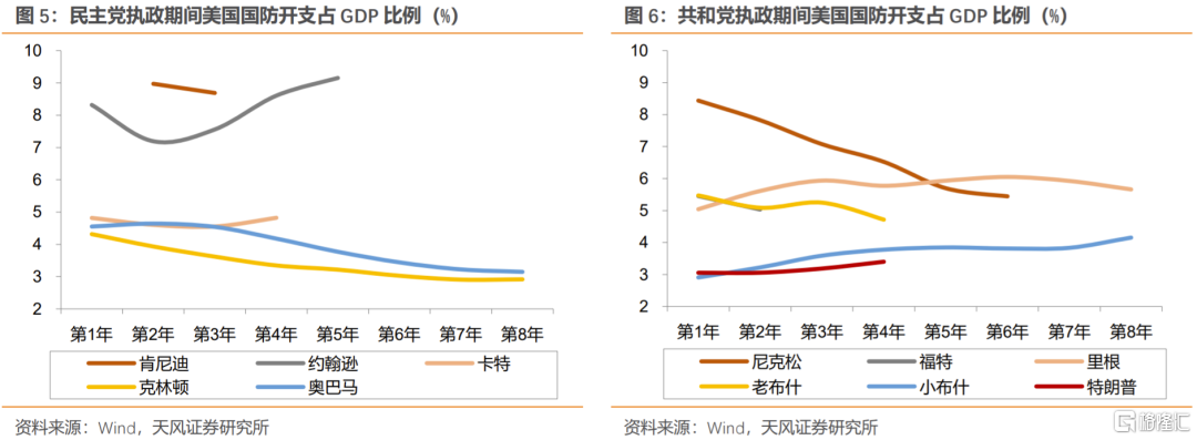 3)對外和軍事政策上,共和黨主張增加軍費預算、加強國防力量,外交上通常推行單邊主義政策;民主黨多主張減少軍費開支,主要用於預防和抵禦外來侵略,更強調集體安全和多邊合作,在外交政策上把人權、經貿等排在第一位。這一點在兩黨執政期間國防開支佔GDP比重的變化上有所反映,可以看到,共和黨總統任內增加國防開支的概率更高。