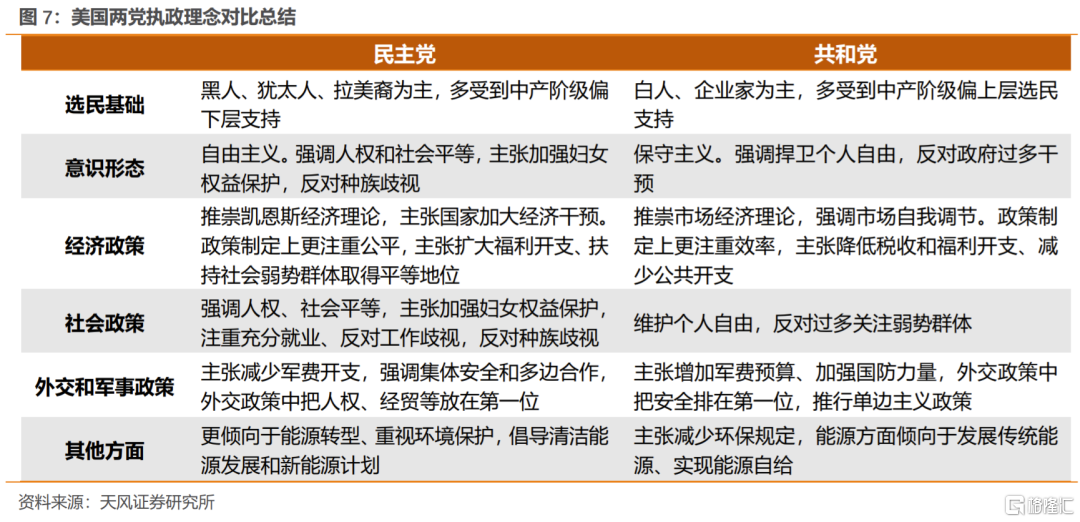 1)經濟政策上,民主黨推崇凱恩斯主義經濟理論,偏好政府幹預;共和黨主張自由放任的傳統經濟理論,強調市場調節。故民主黨更主張擴大福利開支、扶持社會弱勢羣體取得平等地位,政策基調更加註重公平;共和黨則主張降低税收和福利開支、減少公共開支,政策理念上更加註重效率。
