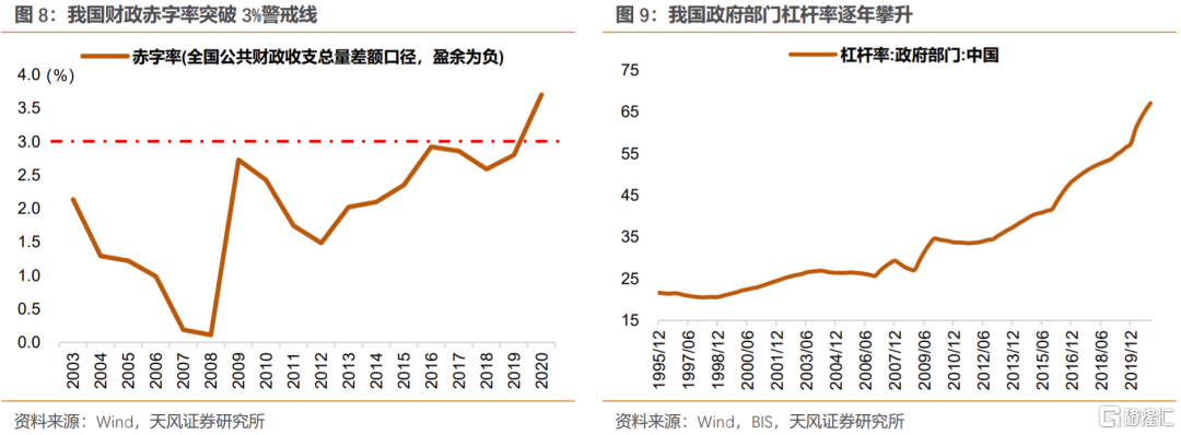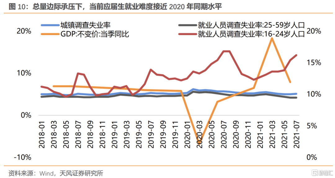 目前我國宏觀經濟面臨總量邊際下行、槓桿率高、失業率上升等壓力。受經濟結構轉型影響,經濟增長中樞正逐年下移,後疫情時代消費修復不充分、對外需承接不力更令總量邊際承壓;與此同時,政府債務和財政赤字壓力正持續攀升,2020年,我國財政赤字率首次突破3%的警戒線,政府部門債務佔GDP比重達到67.10%,較2010年攀升33.4pct,政府槓桿風險與日俱增。就業方面,在“穩增長壓力較小的窗口期”已過的情況下,儘管失業率整體回落至疫情前同期水平,但7月16-24歲人口失業率已升至16.3%,僅次於疫情同期16.8%的歷史高位,總量承壓下,用人需求遞減與畢業生遞增的矛盾有擴大趨勢。
