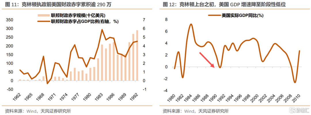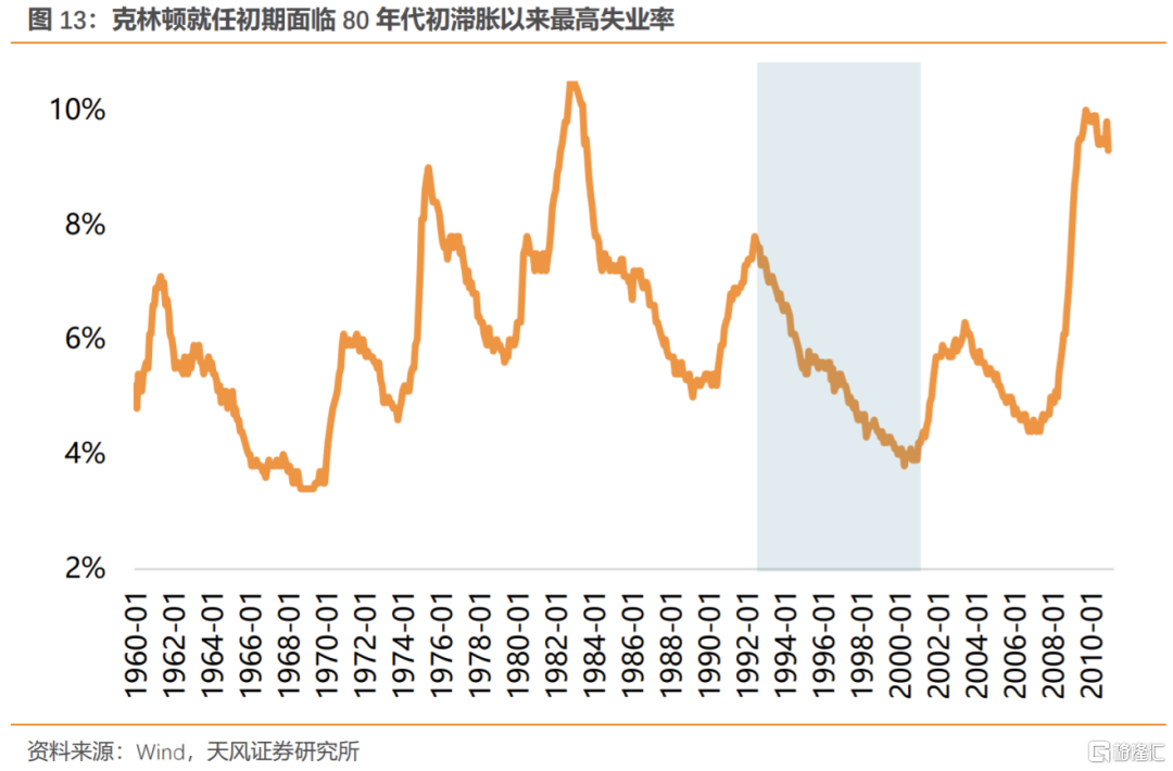 克林頓正式就任於1993年1月,在克林頓就任時點,美國宏觀環境與我國當前情況頗為相像,也存在邊際下行、槓桿率高、失業率上升等風險,經濟前景黯淡。克林頓上台之初,GDP增速降至階段性低點,1991年底美國實際GDP增速為-0.1%,創近十年內新低,接近80年代滯脹時期水平。政府債務方面,1992年聯邦財政赤字達2940億美元,佔GDP比重升至4.53%。1993年1月克林頓就任時,根據國會預算辦公室預測,聯邦預算赤字預計將超3000億美元,佔GDP比重將逾5%,同樣與80年代初經濟衰退時期水平相當。就業方面,1993年1月克林頓就任時,美國失業率為7.3%且正處於新一輪失業高峯中,僅次於1984年水平,國會預算辦公室預計失業率至少仍將連續3年保持在6%以上。