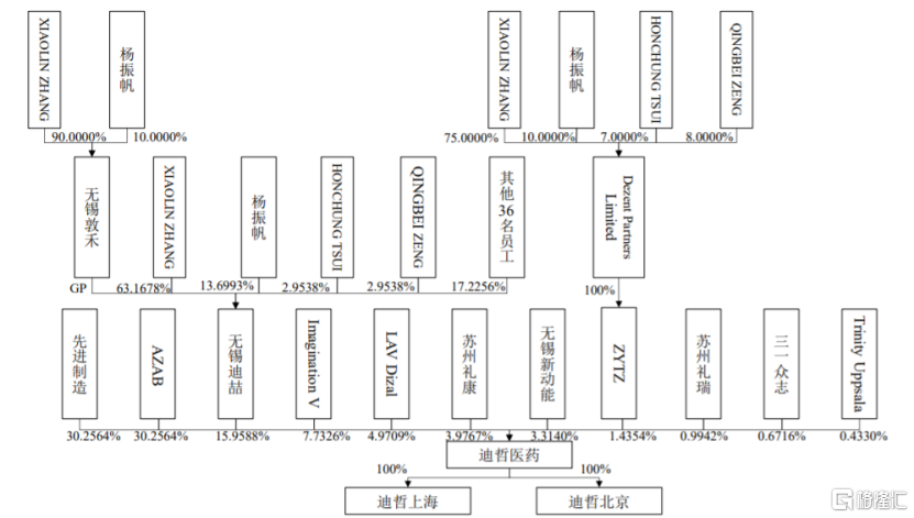 迪哲醫藥成立於2017年,是由AZAB、先進製造、ZYTZ、無錫靈創共同出資設立。IPO前,AZAB、先進製造爲公司並列第一大股東,分別持有30.2564%股份。值得一提的是,AZAB即爲全球領先製藥公司阿斯利康全資子公司。