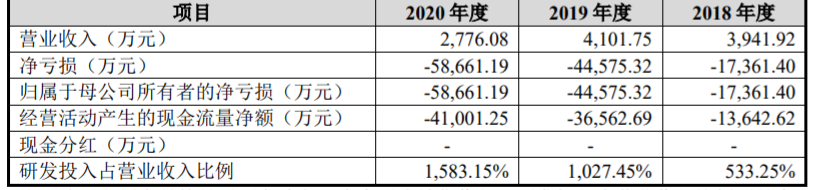 隨着研發費用不斷提升,公司虧損幅度也逐漸擴大。報告期內,其研發費用由2.10億元上升至4.39億元,歸母淨利潤則由-1.74億元擴大至-5.87億元,三年累計虧損爲12億元。