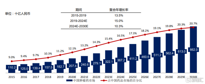 (2015-2030E中國抗腫瘤藥物市場規模,來源:弗若斯特沙利文分析)