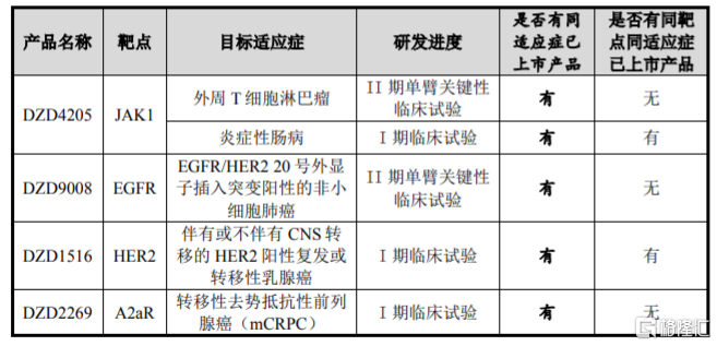 不僅在研發團隊方面,在藥品研發上亦是如此。目前,公司的研發管線中擁有4個處於臨牀階段並用於多個適應症的創新藥,以及多個處於臨牀前研究階段的候選創新藥。其中,DZD9008、DZD1516、DZD2269及DZD8586均系公司自主研發的產品,其餘的DZD4205、DZD0095及DZD2954的化合物專利是公司自阿斯利康處購買所得。