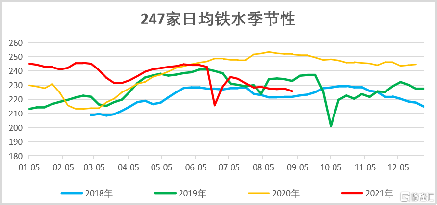 需求:247家鋼廠鐵水日均產量225.63萬噸,周環比-1.82萬噸,繼續下降;