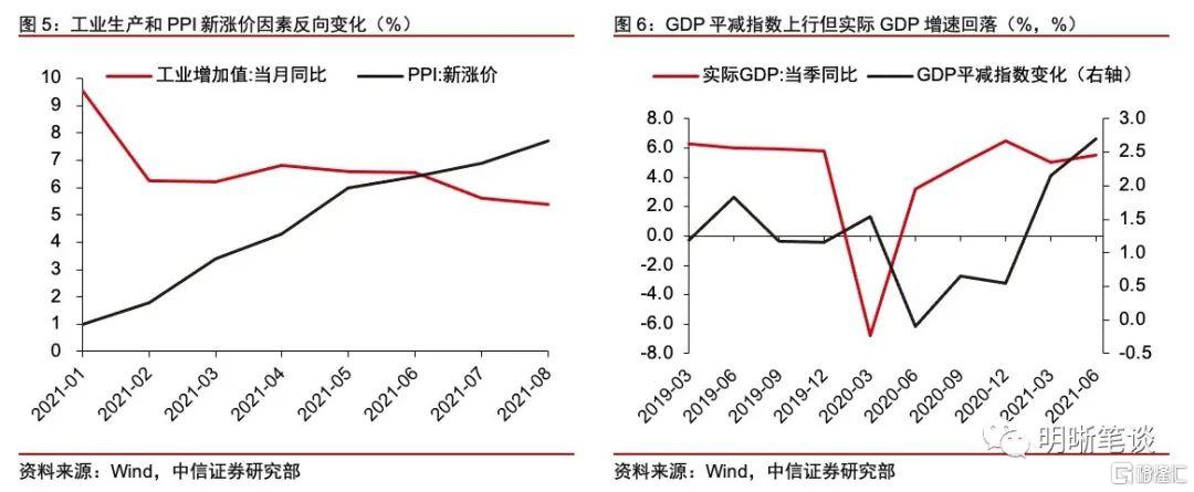 在上下遊價格分化的背景下,7、8月份以來,隨着工業增速開始下滑,經濟“滯”的範圍擴大、程度加深。7、8月份工業增加值兩年平均增速明顯回落,反觀PPI的上漲勢頭並沒有停歇,即便我們剔除基數的影響,只考慮今年的新漲價因素亦是如此。PPI和工業生產增速的剪刀差顯著擴大,意味着工業也開始出現了“類滯脹”的特徵。從GDP的角度去衡量整個經濟,儘管服務價格與核心CPI的表現相對弱勢,但實際GDP增速放緩和以GDP平減指數爲代表的總體物價水平顯著上升並存,也開始在一定程度上呈現出“類滯脹”的特點。