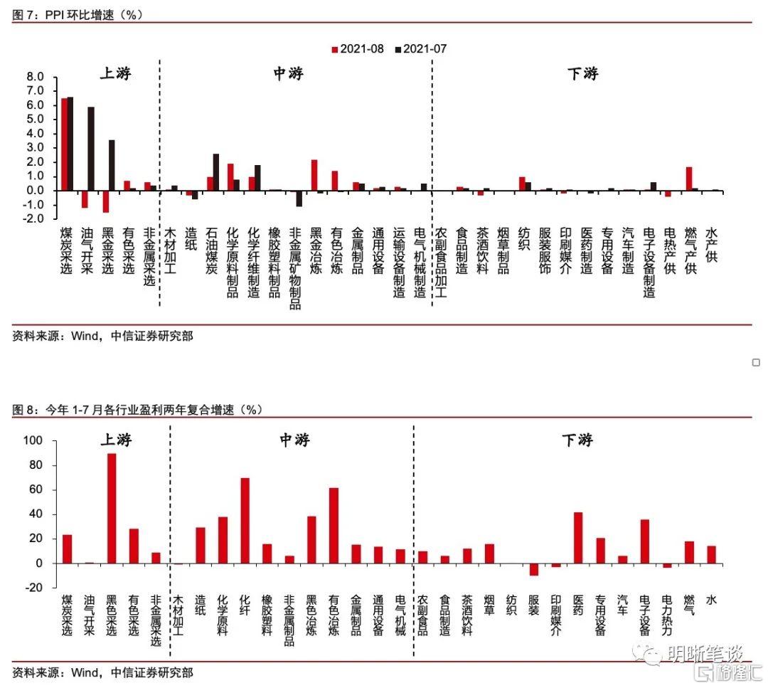 但是,對於經濟而言,產能約束導致“脹”,下遊階段性需求不足導致“滯”,成爲當前制約經濟增長的主要矛盾。下遊需求的階段性下滑,核心的因素來自於兩方面,一是疫情的擾動,對接觸型消費和服務業的抑制;二是宏觀政策的轉向,尤其是針對廣義財政和房地產行業的監管政策,導致相關產業鏈需求的下降。在中上遊價格大幅上漲的情況下,終端需求的疲軟導致下遊缺乏漲價能力,上下遊的通脹呈現顯著的分化,最終使得下遊企業利潤大幅壓縮,經營壓力上升,成爲當前經濟和市場的核心矛盾之一。