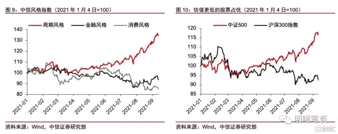 進入三季度,A股市場的分化加劇,映射出市場對於“類滯脹”的擔憂。從風格上看,三季度之後週期風格指數大幅上漲,反映了“脹”的預期,而與經濟運行相關性更強的金融風格和消費風格指數則出現了不同程度的下跌,反映的是“滯”的預期。從估值上看,資金開始向低估值板塊轉移,歷史估值分位數較低的中證500指數大幅跑贏歷史估值水平相對較高的滬深300指數,說明市場在一定程度上擔憂“類滯脹”對於股票估值的壓制。