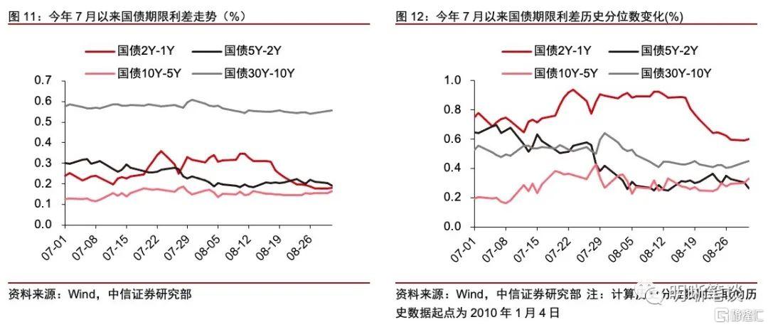 債市反映了“滯”的預期,但對“脹”並不敏感。從期限結構上看,利差的收斂反映了市場對經濟的擔憂有所加劇:中長端利差5Y-2Y,10Y-5Y,甚至是30Y-10Y,在7月下旬至今都大致呈現出下降的態勢,而且其歷史分位數均下降到50%以下,原因主要在於監管因素導致的資產荒以及市場對經濟增速下行擔憂,反映了“滯”的預期。對於通脹,儘管債券市場上多有討論,但利率對通脹的反應並不敏感。從實踐上講,通脹對於利率的影響並不直接,中間要經過貨幣政策作爲媒介。只有央行爲了抑制高通脹而收緊貨幣,纔會導致利率上行。今年至今的情況恰恰相反,央行認爲通脹是結構性的,流動性不但沒有收緊,甚至處於穩中偏鬆的狀態,那麼結構性的通脹就不會對債市產生實質性的負面影響。