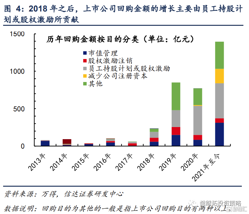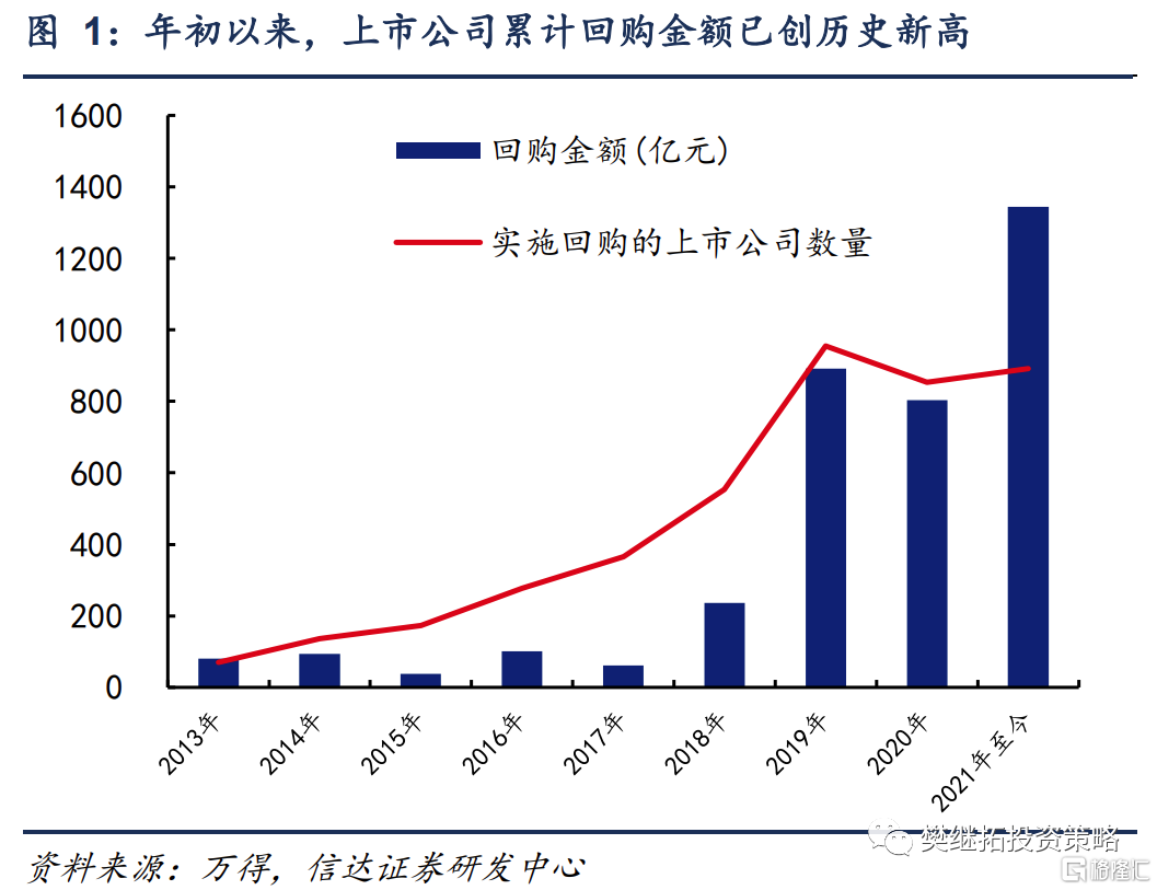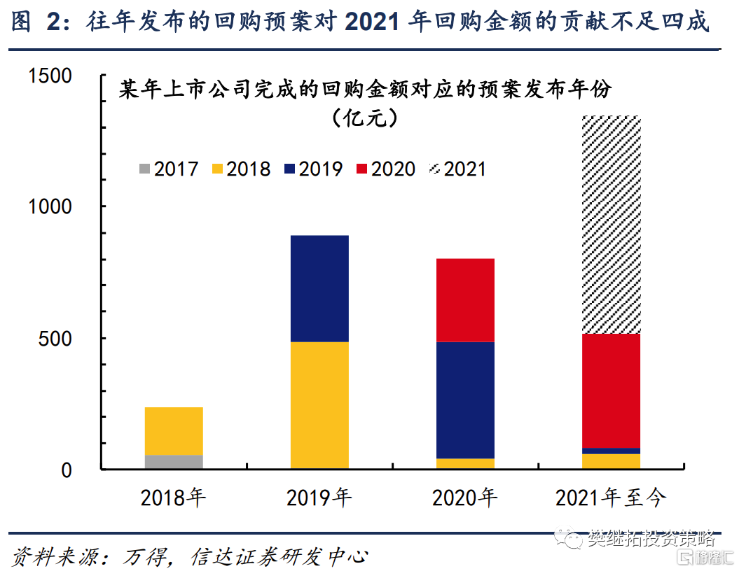 一是,“回購新規”發佈之後上市公司的回購確實活躍了很多,但這似乎無法完全解釋2021年回購金額的大幅增長。“回購新規”在2018年底和2019年初相繼落地,隨後2019年、2020年全年的回購金額分別達到891.52億元和803.37億元。而2021年上市公司的回購行爲愈發積極,如果保持年初以來的熱度,全年回購金額有望達到2020年的兩倍之多。即使考慮到部分上市公司的回購會分多次進行,第一筆回購執行到全部實施完成需要一定的時間,我們依然能看到往年發佈的回購預案對今年回購金額的貢獻不足四成。