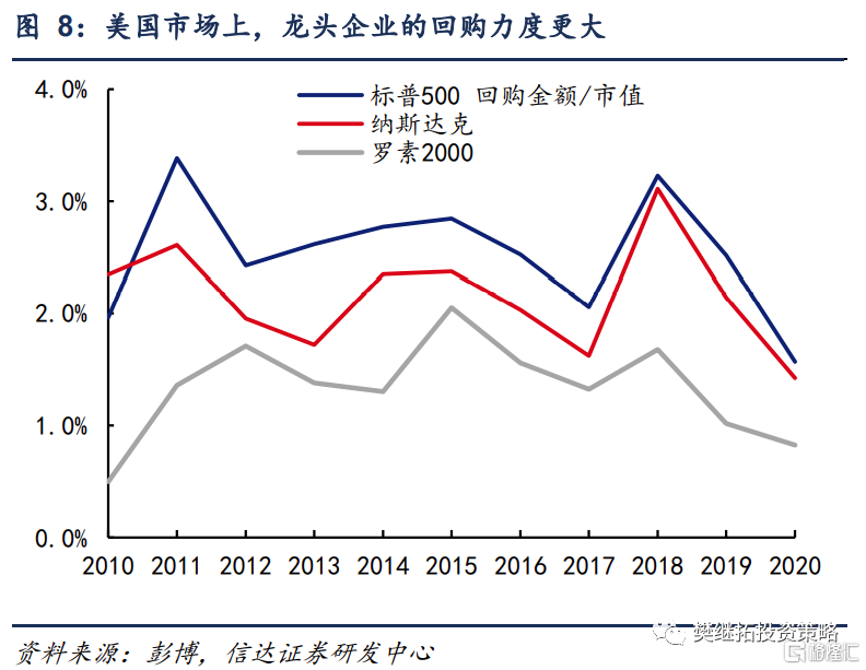 參照美國市場,龍頭企業的回購力度長期高於中小企業。2010年以來,標普500指數、納斯達克指數成份股回購金額佔市值的比例維持爲1.5%-3.5%,而羅素2000指數成份股回購金額佔市值的比例則爲0.5%-2.5%。