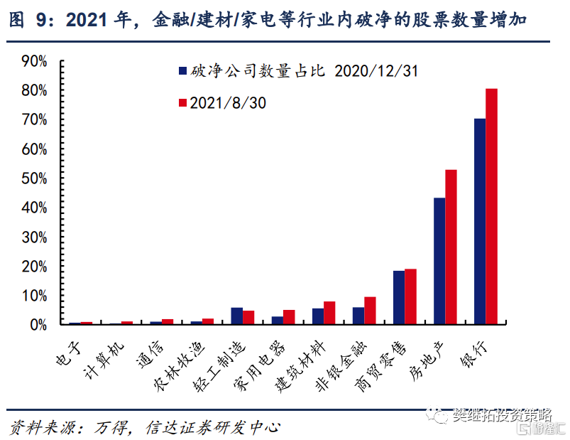 當前A股整體估值不貴,部分行業處於低估狀態。2019年-2020年股市在行業風格、市值風格上均呈現出分化特徵,進入2021年之後市場風格又發生劇烈變動,這些導致A股各行業的估值水平存在不均衡性。截至9月17日,仍有三分之一以上行業估值分位在50%以下,如金融地產、除新能源與半導體行業之外的科技行業、農林牧漁和商貿零售等景氣度不佳的消費行業;有十餘個行業的估值在今年大幅下降、行業內破淨的公司明顯增加,如家電、輕工製造等受到原材料漲價衝擊的行業。