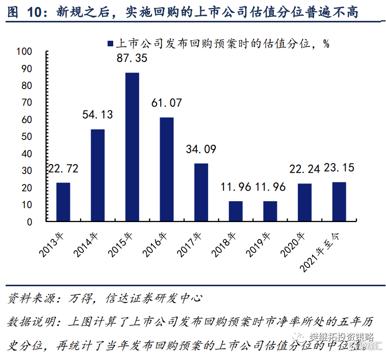 回購新規明確了市值管理式回購的標準,促使更多低估值企業開展回購。回購新規在回購情形中新增了“上市公司爲維護公司信用及股東權益所必需的回購”,相對應的具體標準是上市公司股價低於其每股淨資產,或者20個交易日內股價跌幅累計達到30%。2019年以來,萬得全A指數的市淨率分位數由0.98%提升到了69.54%,但發佈回購預案的多數上市公司估值分位數普遍在5%-30%之間,也就是說開展回購的上市公司的估值相較自身歷史情況是偏低估。此外,2019年以來,破淨公司的回購金額佔比在維持在了10%以上,而在回購新規發佈之前這一佔比不足5%。從今年以來的大額回購案例來看,具有低估值特徵的行業主要集中在公用事業、鋼鐵、汽車、通信等行業中,比較典型的如上汽集團、中國聯通、寶鋼股份均是在股價破淨時發佈了回購預案。