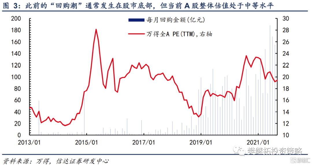二是,此前的“回購潮”通常發生在股市底部,但當前A股的整體估值處於中等水平。歷史上來看,回購金額與股市估值呈反向關係,典型的“回購潮”曾發生於2013年-2014年、2018年底,這些時期萬得全A指數的市盈率均下降到了15倍以下。而今年萬得全A指數的估值雖然有下降,但仍高於2019年全年和2020年上半年的水平。