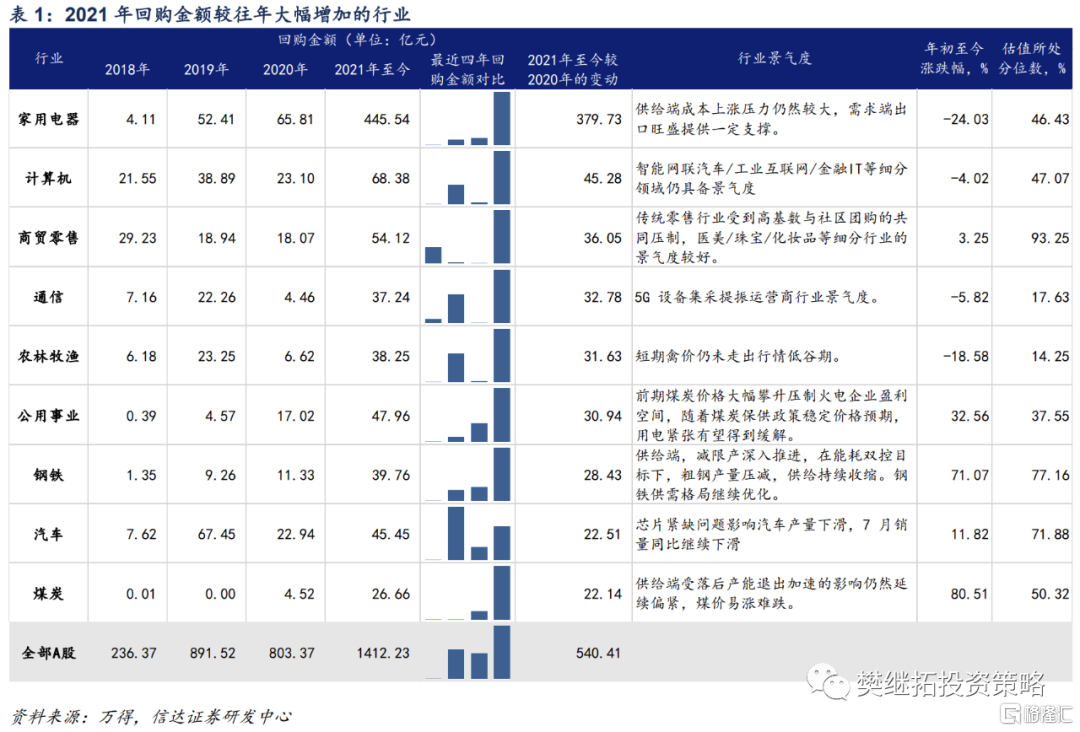年初以來上市公司出現“回購潮”。年初以來上市公司回購金額已超過1400億元,創出歷史新高。如果上市公司回購繼續保持該熱度,全年回購金額有望達到2020年的兩倍之多。分行業來看,今年回購金額較多的行業可以概括爲兩類,一類是以家電、農林牧漁、食品飲料爲代表的“景氣度中性/下行+回調幅度大”的行業,另一類是以煤炭、鋼鐵爲代表的“景氣上行+前期漲幅不足”的行業。