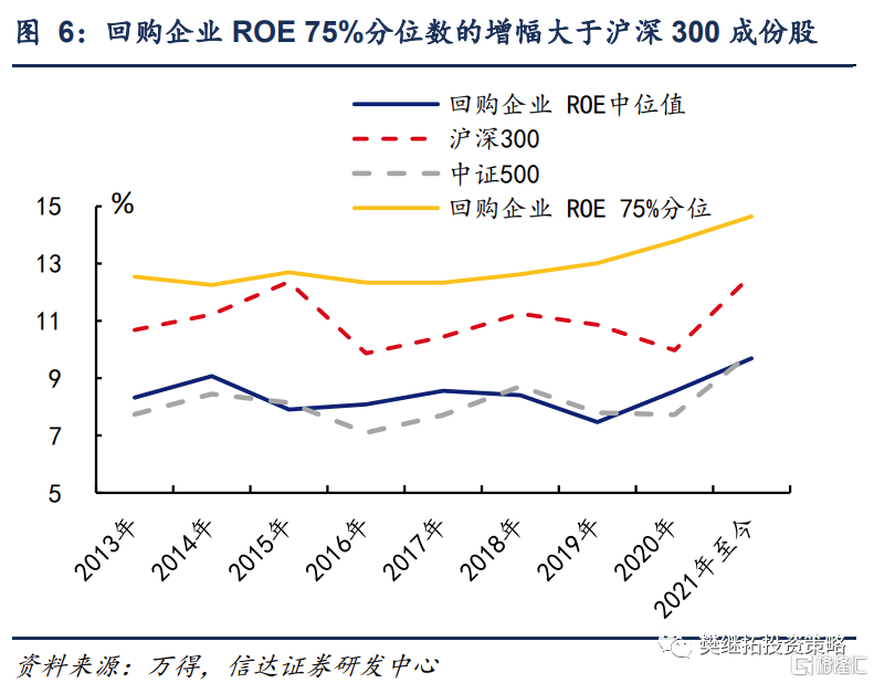 大額回購案例涌現的本質是龍頭企業開展回購的積極性增強。實施回購的企業ROE中位值由2018年的8.41%增加至9.69%,ROE的75%分位值由2018年的12.63%增加至14.65%(增幅爲2.02pct,同期滬深300成份股的ROE的增幅爲1.35pct);實施回購的企業自由流通市值由2018年的32.30億元增加至36.68億元,自由流通市值的75%分位值由2018年的55.94億元增加至98.61億元(增幅略高於中證500成份股的增幅)。滬深300成份股回購金額佔流通市值的比例由2018年的3.93‰增加至20.86‰,增幅爲16.93個千分點,而同期中證500成份股、中證1000成份股回購金額佔流通市值的比例增幅僅爲7.44‰、5.11‰。